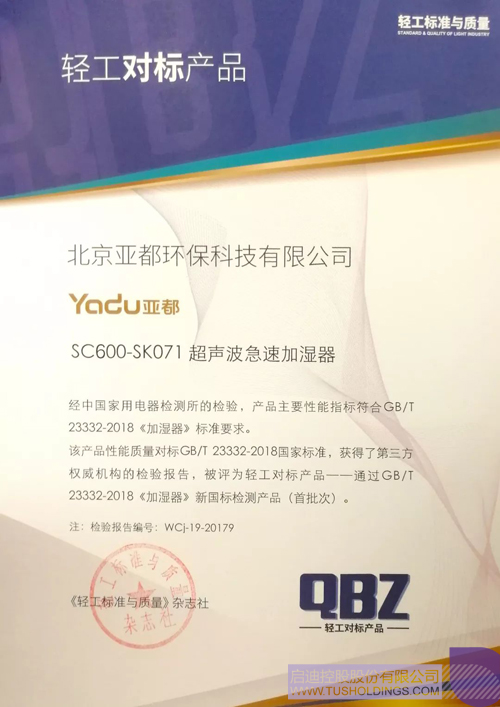 啟迪企業(yè)丨亞都SC600-SK071急速加濕器被評(píng)為首批次通過新國標(biāo)檢測(cè)產(chǎn)品打印